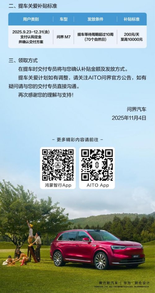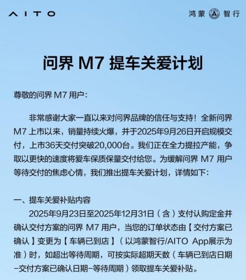 此次问界M7提车关爱计划主要针对2025年9月23日至2025年12月31日(含当日)期间,支付认购定金并确认交付方案的用户。