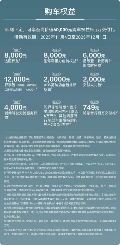 这种“硬实力托底+软服务暖心”的组合,正是30万元级SUV市场中,“国民SUV幸福旗舰”能持续打动用户的核心原因。目前,全新问界M7正在持续热销,2025年11月4日至2025年12月1日期间下定,可享至高价值60,000元购车权益和百万交付礼,购车良机不要错过!